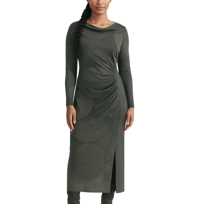 Mooie lange (tot ver over de knie) travelstof jurk met split schuin aan de voorzijde. De jurk heeft een watervalhals en lange mouwen tot boven de polsen. De geplooide taillering verdoezeld oneffenheden als een buikje.