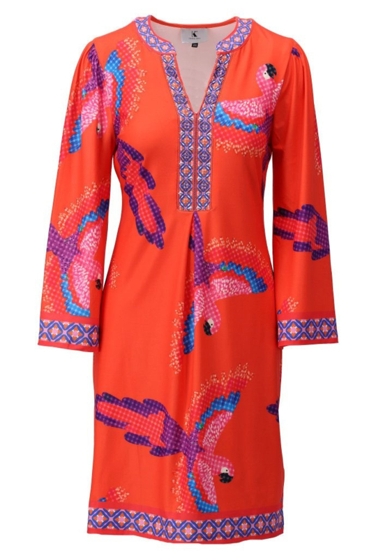 Deze jurk van K-design combineert een krachtige koraalrode kleur met een speelse papegaaienprint en verfijnde etnische details. De V-hals en lange mouwen geven de jurk een elegante, vrouwelijke uitstraling met een exotische twist.
