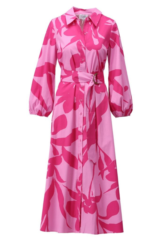 Deze K-design maxi jurk straalt pure zomerse charme uit dankzij de opvallende roze print en het stijlvolle doorknoopdesign. De klassieke kraag en lange mouwen geven de jurk een chique uitstraling, terwijl de bijpassende ceintuur zorgt voor een mooi vrouwelijk silhouet. Perfect voor zowel overdag als een zomerse avond.